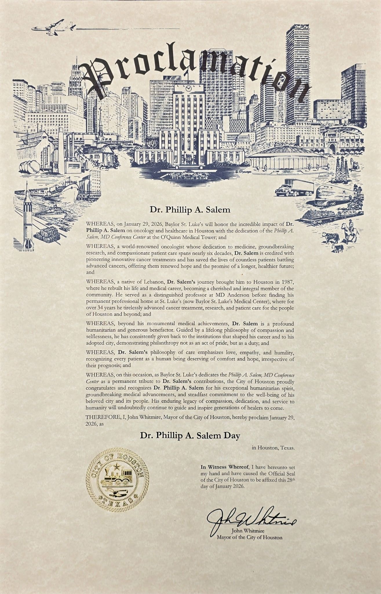 n recognition of his remarkable achievements and service to the community, Houston Mayor John Whitmire issued an official proclamation declaring January 29, 2026, as Dr. Phillip A. Salem Day in the City of Houston.
