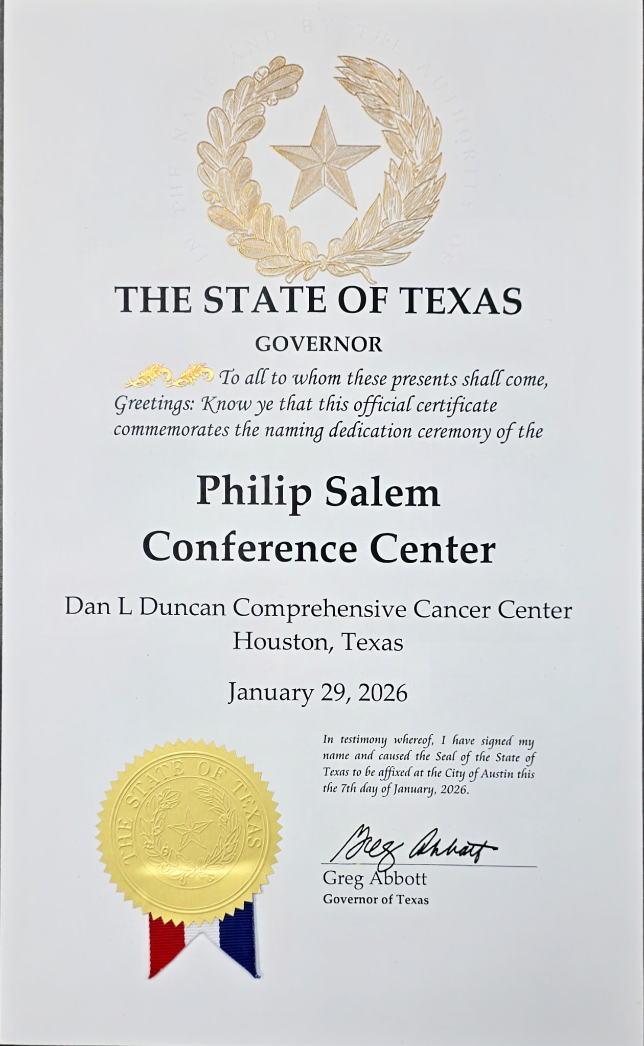 Presented by the State of Texas, the certificate acknowledges the significance of the conference center dedication and honors Dr. Salem’s lifelong contributions to the advancement of medicine and cancer care.